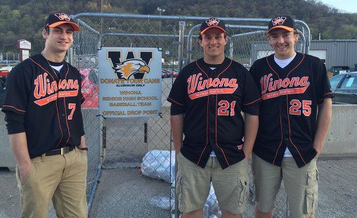 The Winona Senior High School baseball team captains stand in front of one of five aluminum can cages out in the Winona community supplied by Matejka Recycling. The money raised from the collecting of aluminum supports the Winhawk baseball program.